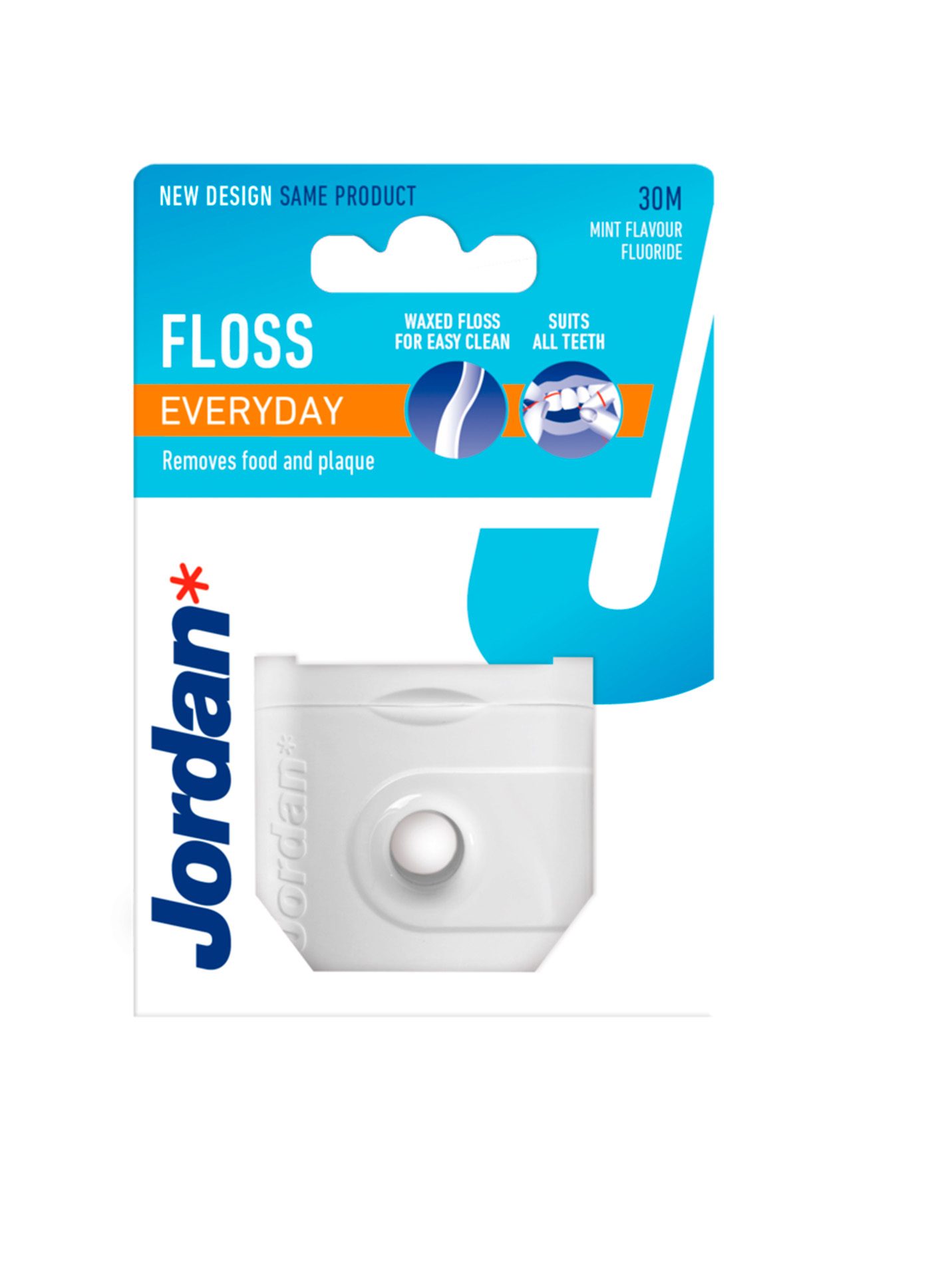 Jordan Everyday Floss er en tynd rund tandtråd, der er glider let mellem tænderne. Den er belagt med en ikke-vandopløselig voks og myntesmag. Voksen gør, at tandtråden glider nemmere mellem tænderne. God værdi for pengene, velegnet til alle interdentale mellemrum.