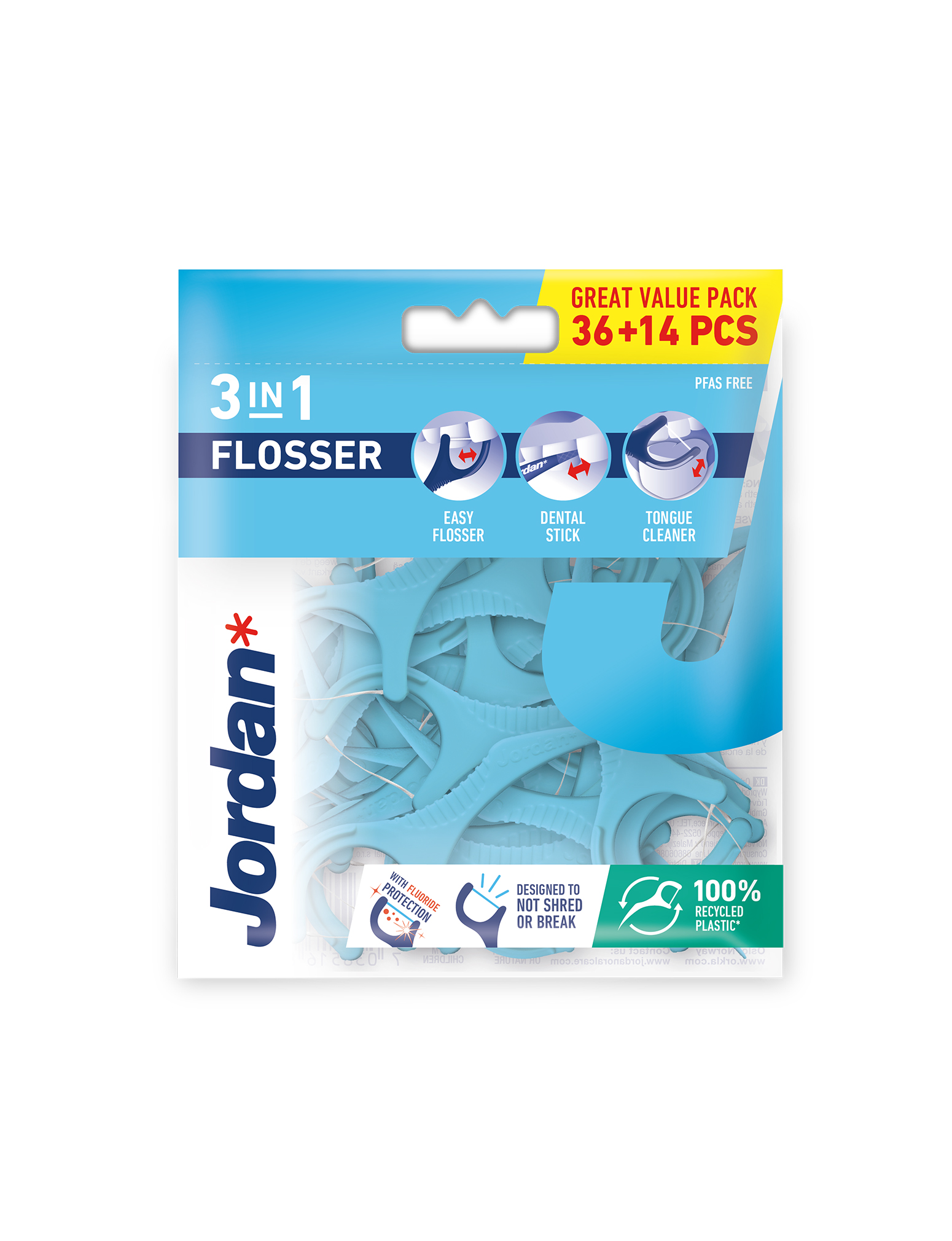 Jordan 3-in-1 flosser is een handige en gebruiksvriendelijke flosser gemaakt van 50% gerecycled en voedselveilig plastic.