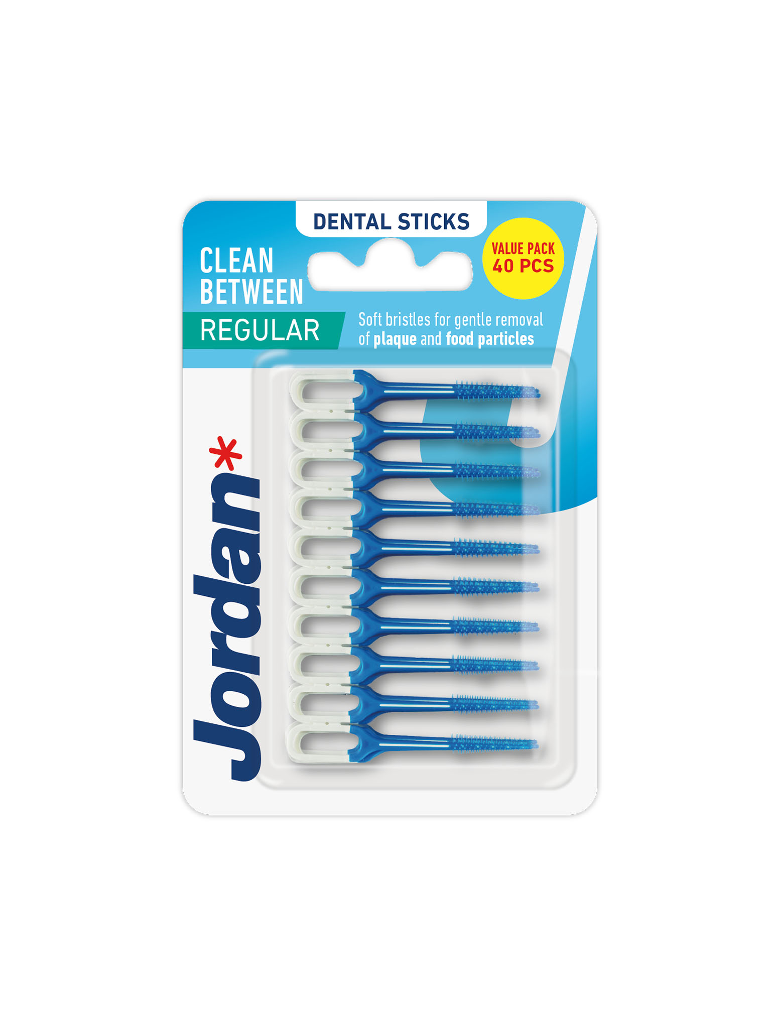 Jordan Clean Between Sticks voor het voorzichtig verwijderen van tandplak en voedselresten. Gemakkelijk in gebruik: voeg de stoker voorzichtig in de ruimtes tussen de tanden en maak zachte heen-en-weer gaande bewegingen. De flexibele borstelharen helpen tandplak en voedselresten te verwijderen. Niet forceren in nauwe ruimtes tussen de tanden. Door Clean Between Sticks te gebruiken, masseert en stimuleert u effectief uw tandvlees. Dit helpt u om een gezond gebit en tandvlees te behouden en geeft u een fris en schoon gevoel. Je kunt kiezen uit de varianten blauwe Regular (normaal) en oranje Large (groot), beide zijn op smaak gebracht met munt en bevatten fluoride.