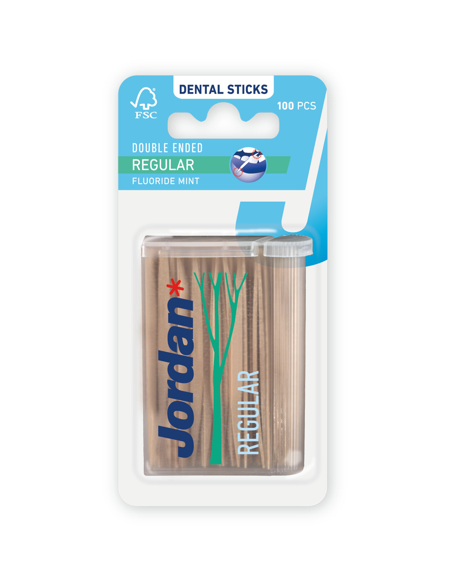 De Jordan Tandenstokers Regular bevat dubbelzijdige tandenstokers met mintsmaak en toegevoegde fluoride. De tandenstokers zijn geschikt voor mensen met normale tot wijde interdentale ruimtes. De tandenstoker is gemaakt van berkenhout, is geslepen aan beide uiteinden en heeft een driehoekige vorm die gemakkelijk glijdt tussen de tanden.