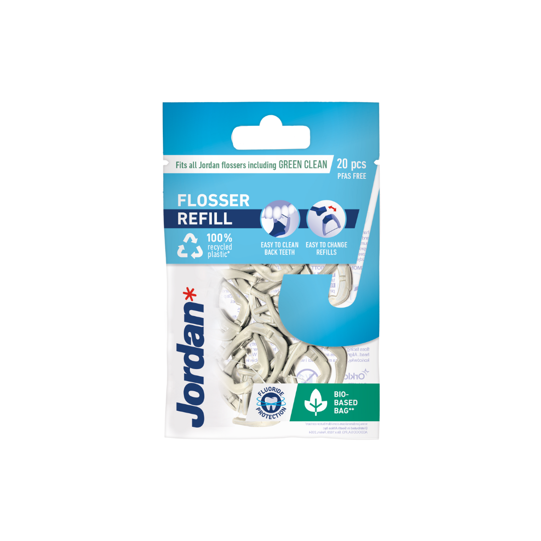 Jordan Easy Clean Refill er separate tanntrådbøyler som passer Jordan Easy Clean Flossere. Refillen selges både i dagligvarebutikker og apotek. Hver pakke inneholder 20 refillhoder.