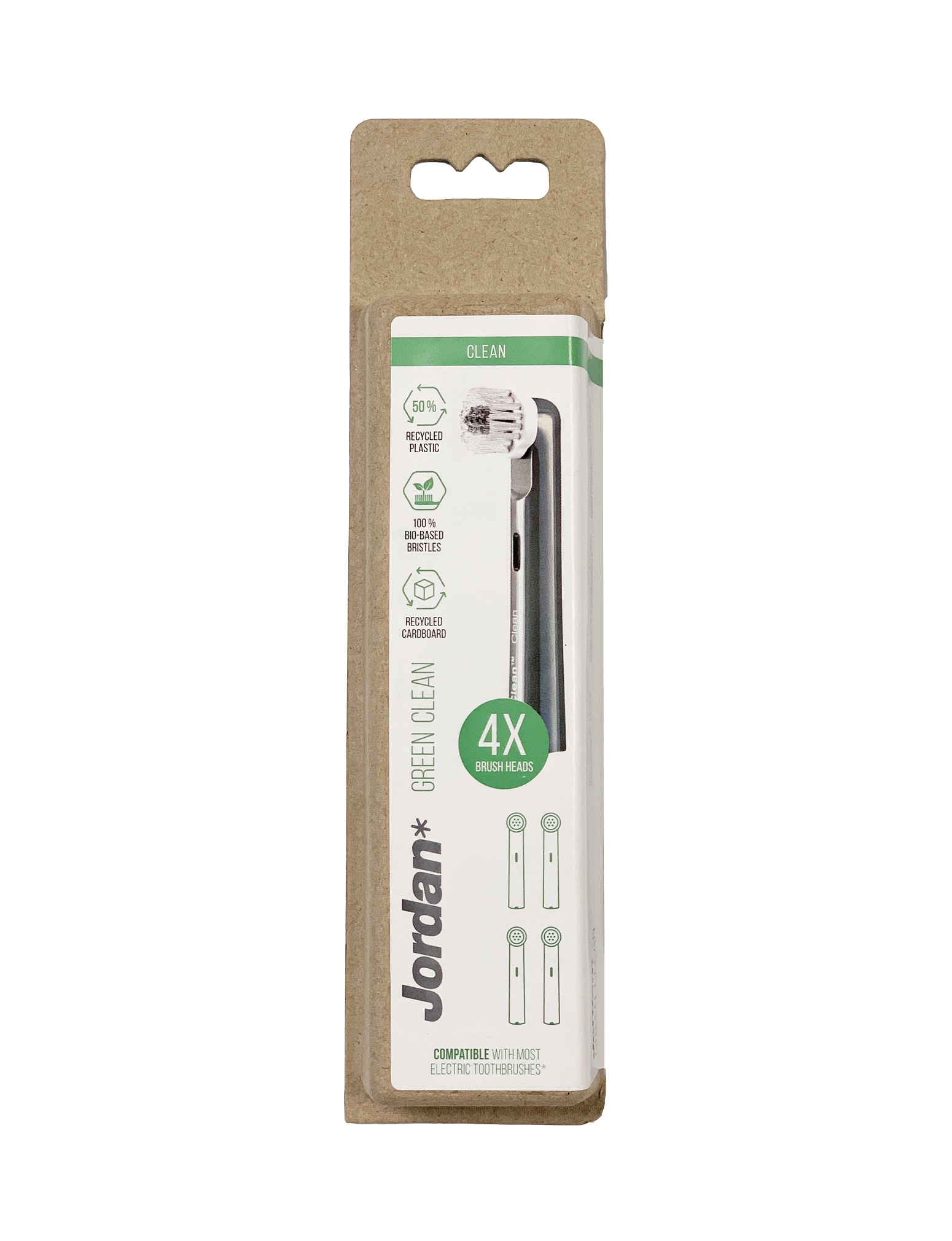 Jordan Green Clean brush heads gives you an efficient and gentle cleaning. The brush heads are made of 50% recycled plastic and are compatible with most electric toothbrushes. The bristles are made of 100 % bio-based nylon originating from castor oil, which is a renewable resource. The packaging is made of 100 % recycled paper fibres.